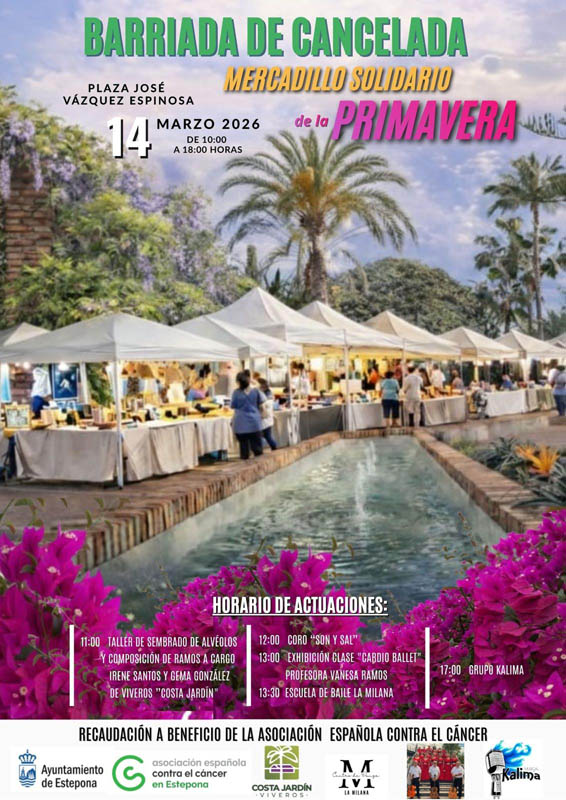 Marbella, 11 de marzo de 2026.- El Ayuntamiento de Estepona informa organiza el próximo sábado 14 de marzo en la barriada de Cancelada el Mercadillo Solidario de Primavera, una iniciativa a beneficio de la Asociación Española contra el Cáncer (AECC) que se desarrollará de 10:00 a 20:00 horas en la plaza José Vázquez Espinosa.
