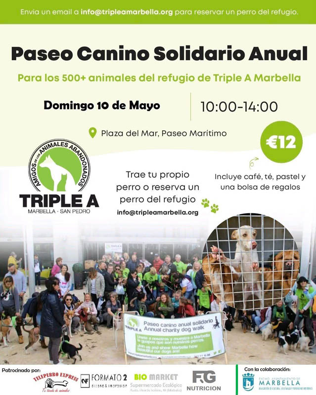 El próximo 10 de mayo 2026 , Triple A Marbella organiza su Paseo Canino Anual Solidario que tendrá lugar en horario de 10,00h a 14,00h en Plaza del Mar, paseo marítimo.