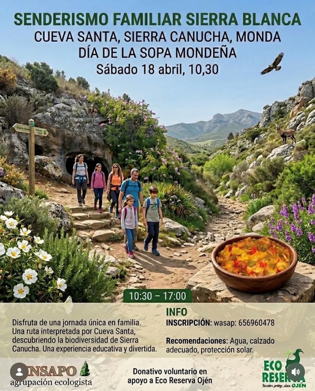 Para culminar nuestra ruta por los límites de nuestra Sierra Blanca, llegaremos a la plaza del pueblo de Monda para celebrar el Día de la Sopa Mondeña. Disfrutaremos de la degustación de compartir un «dornillo» gigante de comida tradicional acompañado de música en vivo. La mejor forma de conocer nuestras raíces. ¡Un homenaje vivo a nuestra tierra y a nosotros!