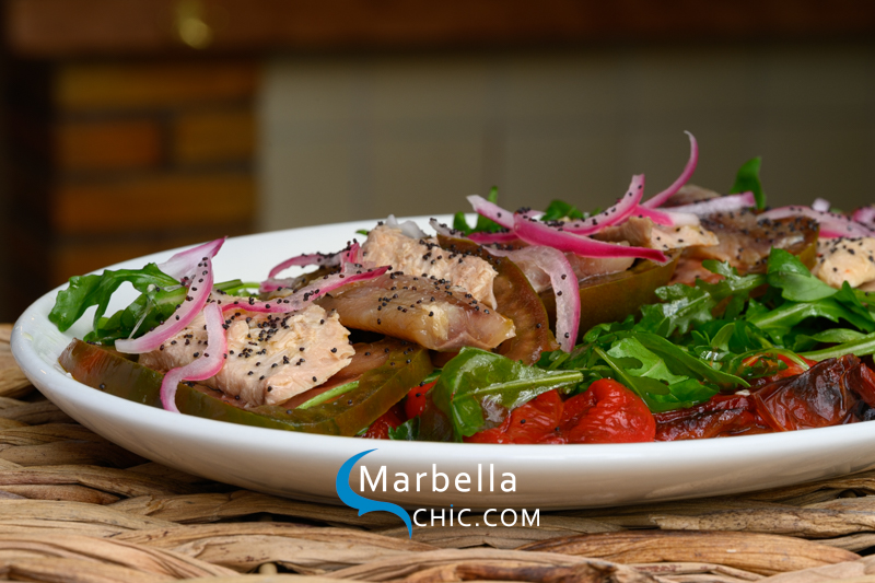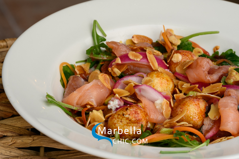 Las ensaladas aportan frescura y estética: la Burrata verde, la Rúcula ahumada o el Antojo de salmón y cabra, cada una con su sello propio.