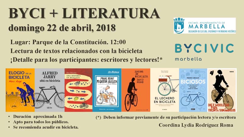 El domingo 22 de abril a las 12:00 en el Parque de la Constitución, Marbella ByCivic celebrará junto a la Delegación de Cultura del Ayuntamiento de Marbella y, coordinado por Lydia Roma, este bonito evento uniendo bicicleta y la literatura, dentro del Mes del Libro y como anticipo del Día Internacional del Libro. Se leerán textos de escritores conocidos donde la bici es parte de ellos, pero también está abierto a que el que quiera presente un texto propio y lo lea. Se entregará un detalle a todos los participantes escritores y lectores. (Que deberán comunicar previamente)