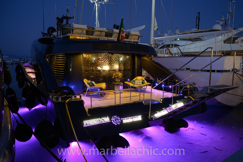 El diseñador italiano Roberto Cavalli llegó este lunes a Puerto Banús, Marbella, a bordo de su nuevo yate Freedom procedente del puerto de Mallorca. Su nuevo barco se llama ‘Freedom’, tiene 28 metros de eslora y alcanza 40 nudos de velocidad. es un moderno barco de color negro metalizado que simula a “Batman” y cuya decoración no puede pasar inadvertida con estampados de piel de animales africanos en sus cojines y tapizados .