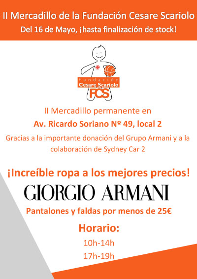 La Fundación Cesare Scariolo reabre el Mercadillo Armani tras el éxito obtenido el pasado mes de abril. Cientos de prendas que aún no han sido expuestas se pondrán a la venta a partir del próximo día 16 de mayo y hasta el fin de las existencias. La empresa Sydney Car 2 ha vuelto a ceder a la FCS su espacio, ubicado en la avenida Ricardo Soriano 49, local 2 (junto a Pronovias), durante el tiempo necesario para que todos los ciudadanos tengan la oportunidad de adquirir nueva ropa de la firma Armani por menos de 25€. Se pueden encontrar faldas por 25€ y pantalones por 20€. Todo un lujo de prendas a precios prácticamente simbólicos. El horario de venta al público será de 10:00 a 14:00 horas y de 17:00 a 19:00 horas. Todo el dinero que se recaude con esta iniciativa irá destinado, íntegramente, a la labor social que la FCS desarrolla con los niños oncológicos y sus familias en la provincia de Málaga. Esta donación fue posible gracias a la relación existente entre el diseñador Giorgio Armani y Sergio Scariolo, entrenador del equipo de baloncesto que posee el estilista en Milán. La ropa, catalogada en diferentes tallas para hombres y mujeres, se ha marcado con un precio que no alcanzan ni la mínima parte de su valor real en el mercado, teniendo en cuenta que se trata de una mercancía de gran calidad expresamente procedente de Italia para esta iniciativa.