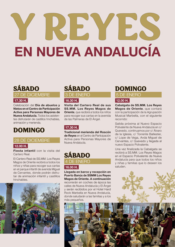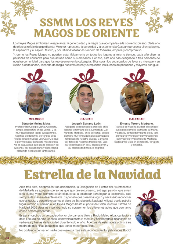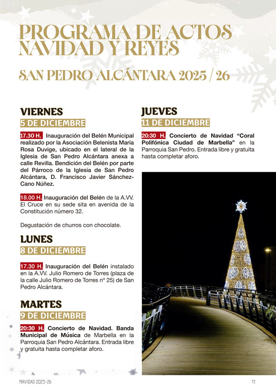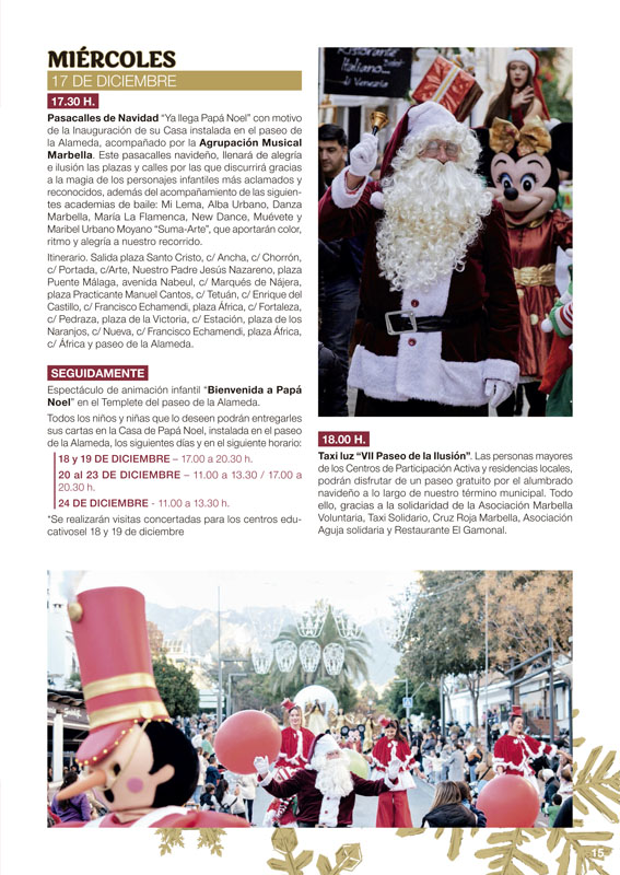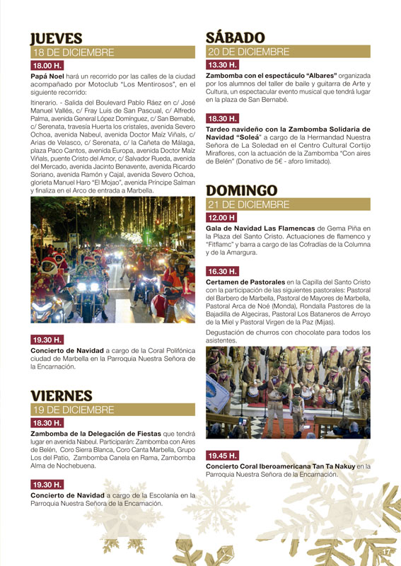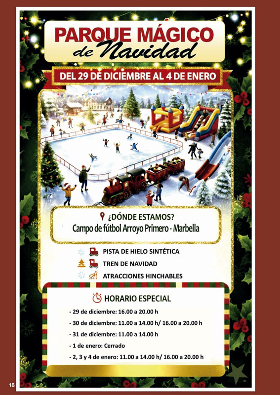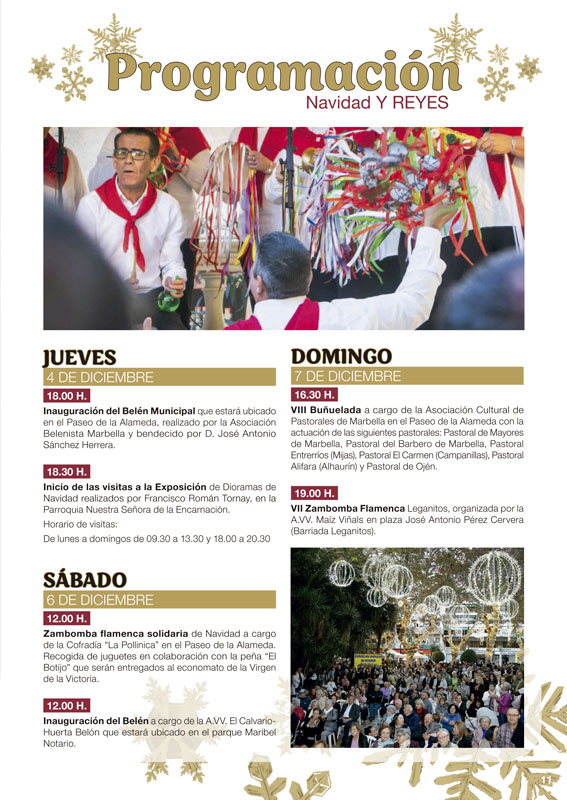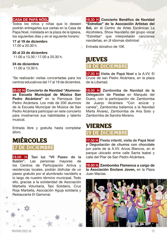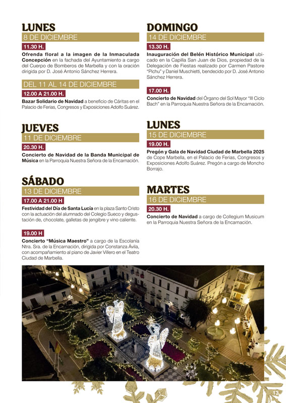 Programa de Navidad de Marbella 2025-2026. La Navidad en Marbella 2025–2026 promete convertirse en una de las más especiales de los últimos años. La ciudad se prepara para ofrecer un programa repleto de actividades, espectáculos, iluminación y mercadillos que llenarán de magia cada rincón del municipio. Un calendario pensado para disfrutar en familia, con amigos o en pareja, tanto por residentes como por los miles de visitantes que eligen Marbella para vivir unas fiestas inolvidables.