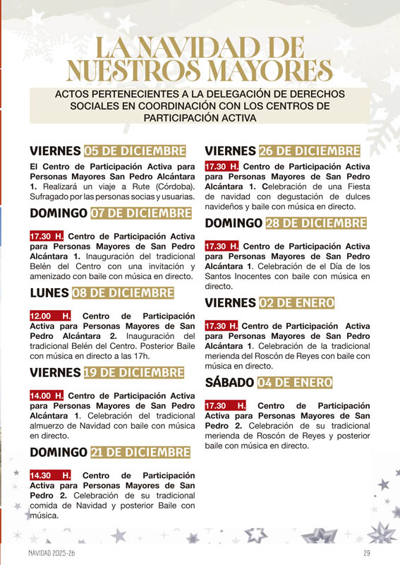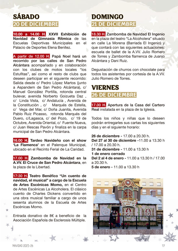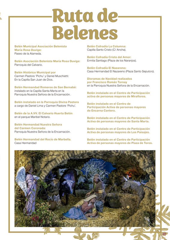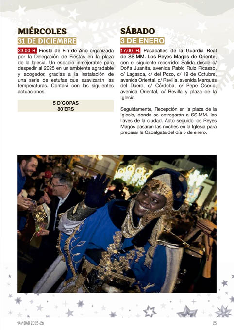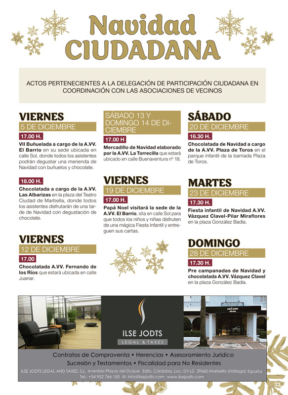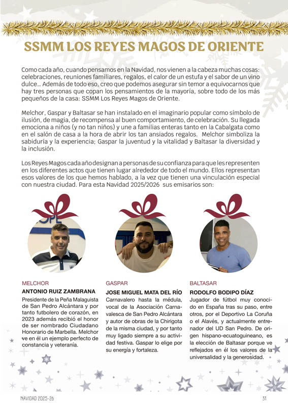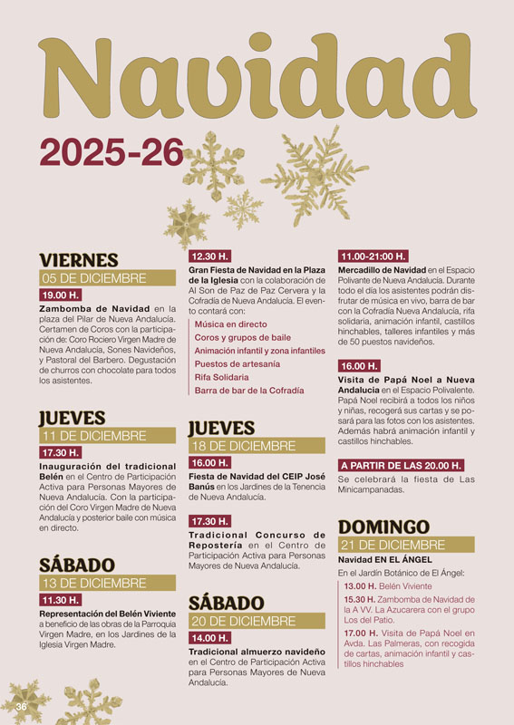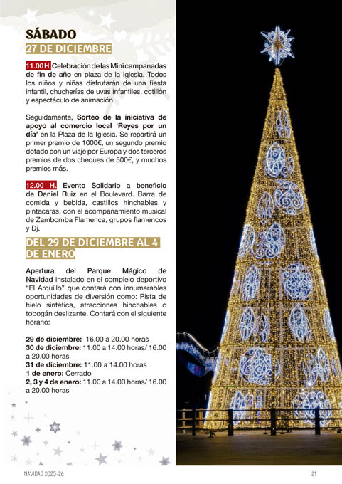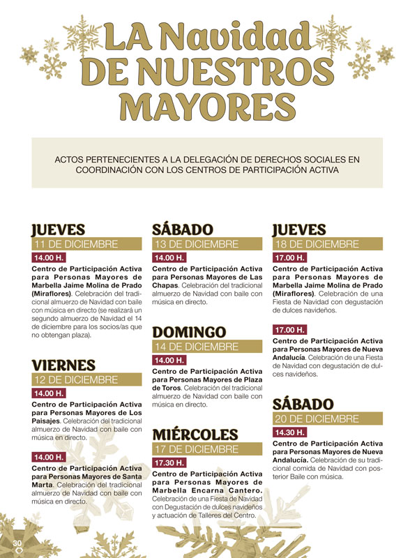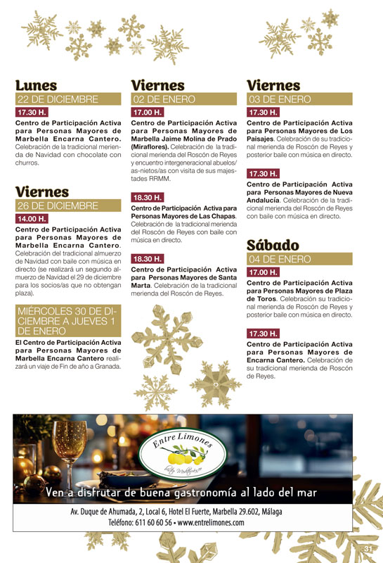 Programa de Navidad de Marbella 2025-2026. La Navidad en Marbella 2025–2026 promete convertirse en una de las más especiales de los últimos años. La ciudad se prepara para ofrecer un programa repleto de actividades, espectáculos, iluminación y mercadillos que llenarán de magia cada rincón del municipio. Un calendario pensado para disfrutar en familia, con amigos o en pareja, tanto por residentes como por los miles de visitantes que eligen Marbella para vivir unas fiestas inolvidables.