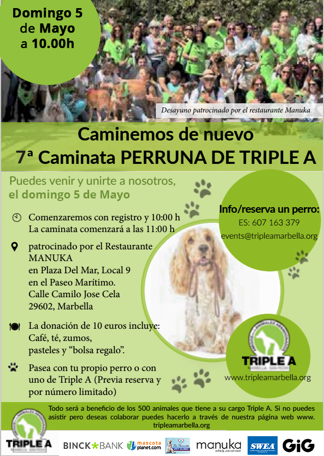 Tenemos el placer de invitarles a nuestra VII Caminata Solidaria que tendrá lugar el Domingo 5 de mayo a las 10.00 horas. Nuestro punto de partida, será como en años anteriores el Restaurante Manuka, Plaza del Mar, Paseo Marítimo. La inscripción y desayuno comenzara a las 10.00 horas y comenzaremos la caminata a las 11.00 horas. A cambio de un donativo de 10€, recibirás una bolsita con regalitos sorpresa, una bandana para tu perro, una camiseta conmemorativa del evento y otros regalos sorpresa. Puedes caminar con tu propio perro o reservar un perro de la Triple A (número limitado). Si no tienes perro puedes pasear con nosotros en este bonito evento , queremos que todo Marbella vea lo guapos que son nuestros perros. Para inscribirse y reservar un perro, diríjase a events@tripleamarbella.org o llame a 607163379