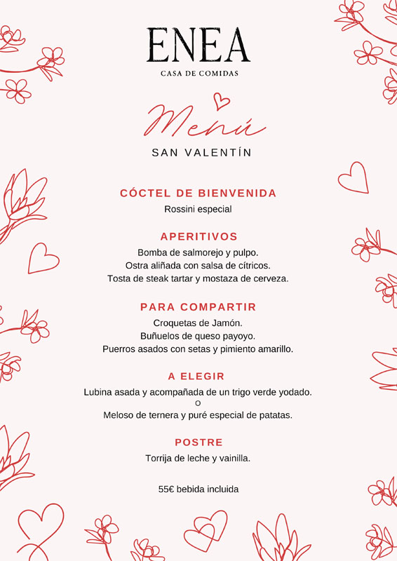 Y para este San Valentín, tienen preparado este magnífico menú y la oportunidad de no pagar la cuenta esa noche… sí, como lo oyes, entre las mesas/parejas asistentes ( de dos en dos) se hará un sorteo y la pareja ganadora no pagará la cuenta. Así que no tienes excusa ¡¡ Reservas … Tel+ 34 633194694