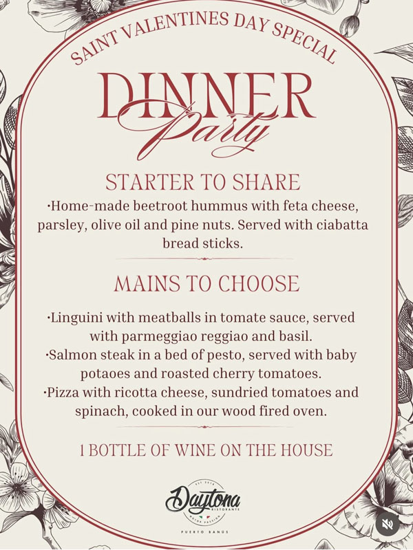 Celebra el amor en Daytona Motor Passion con una cena de San Valentín única en Puerto Banús. Este es el menú que ha preparado por tan sólo 25€ por persona. Reservas en el teléfono +34 951 569 194 o en info@daytonamotorpassion.com